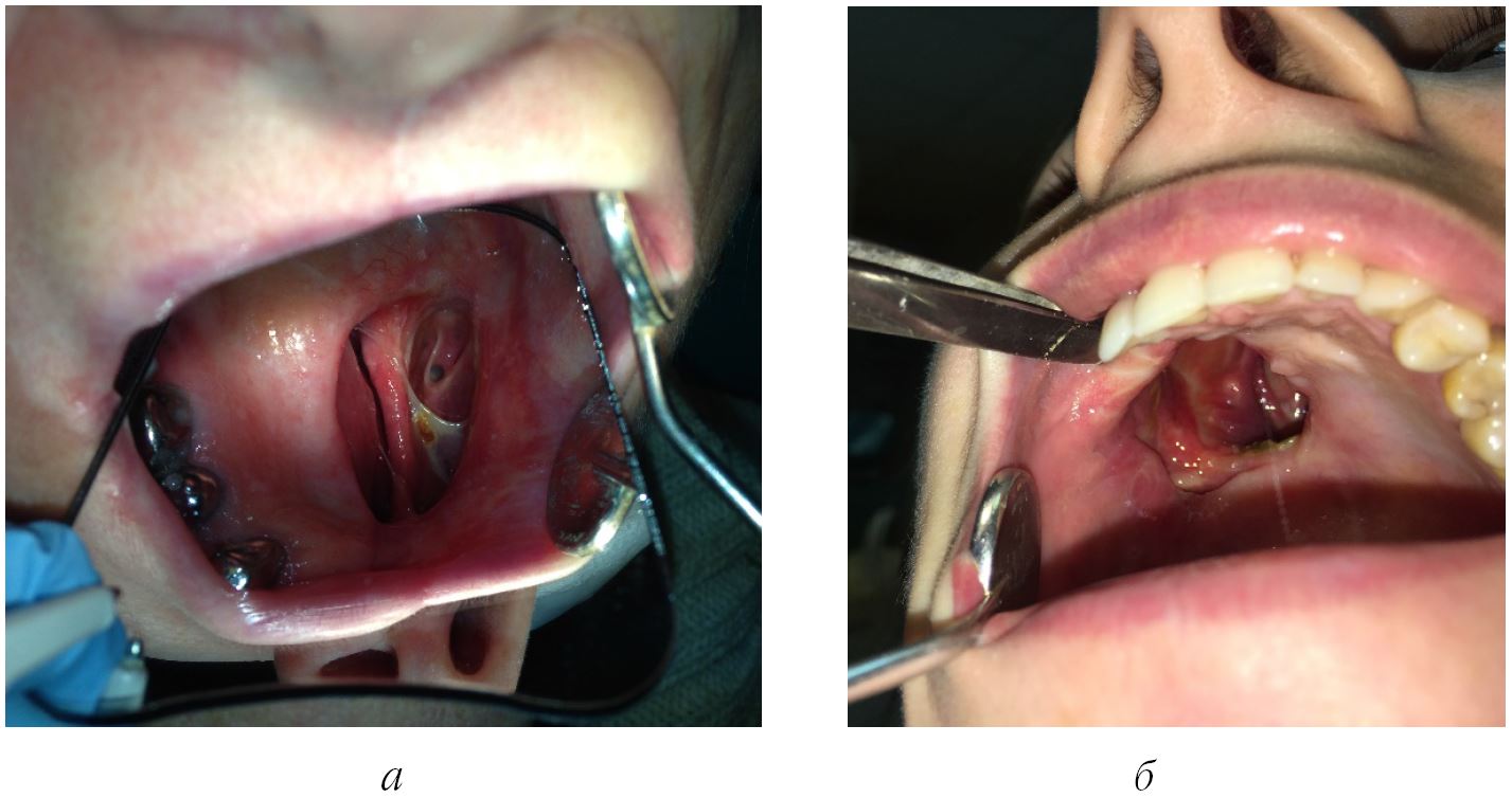 Рис. 1. Клинические случаи: а – пациентка М., 65 лет: пострезекционное ороназальное сообщение слева (вид через зеркало); б – пациентка К., 27 лет: пострезекционное ороназальное сообщение справа