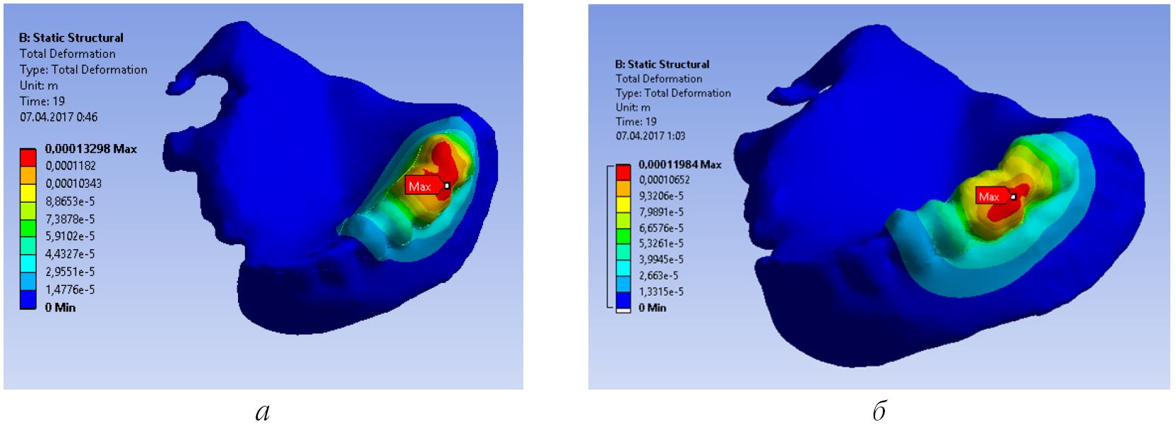 Рис. 2. 3D-модель пострзекционного протеза на верхнюю челюсть (биомеханическое моделирование спроектированной ситуации): а – поле перемещений и максимальные значения при вертикальной нагрузке; б – поле перемещений и максимальные значения при горизонтальной нагрузке