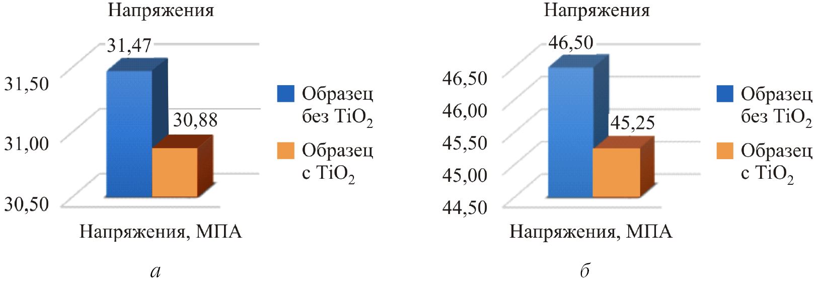 Анализируя полученные данные механических испытаний, было определено, что при введении в состав термоинжекционного полиамида армирующего компонента (наноразмерный диоксид титана) происходит увеличение максимальных напряжений и модуля Юнга на 8,4 и на 7,2 % соответственно, что отвечает нормативам стандарта ISO 1567: 1999 Dentistry – Denture base polymers (Стоматология. Полимеры для базисов зубных протезов).