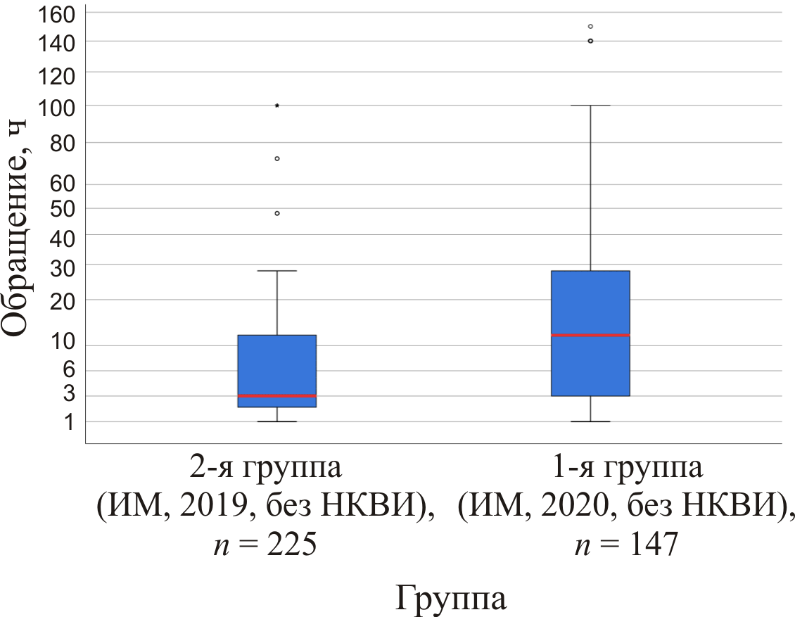 Выявлено, что пациенты с ИМ и НУО в период пандемии в 2,18 раза чаще попадали в приемное отделение регионального сосудистого центра после 12 ч от начала развития приступа (ДИ: 1,095–4,327) (рис. 1). Видим увеличение длительности реагирования пациента на боль в груди, увеличение ожидания бригады скорой медицинской помощи (СМП), а также более долгий этап маршрутизации пациента, в том числе вызванный задержкой при поступлении в ЧКВ-центр.