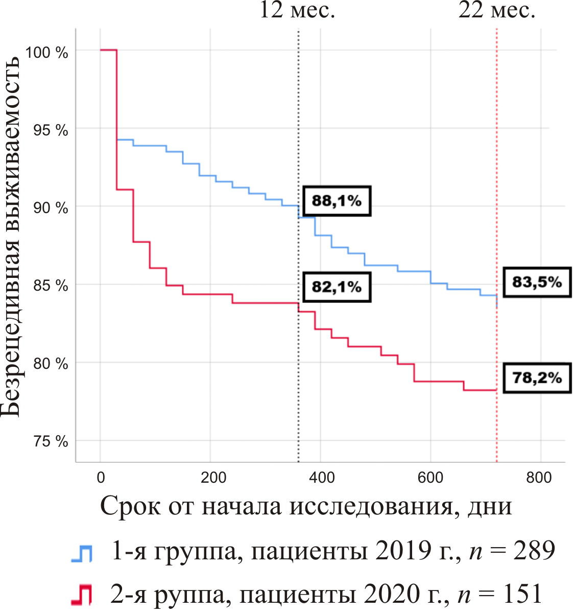- При оценке безрецидивной выживаемости выяснено, что в 2020 г. остается 82,1 % больных от исходного количества, а в 2019 г. – 88,1 %, разница значительная. По окончанию 24 месяцев наблюдения только 78,2 % с ИМ и НУО остались в живых в 2020 г., при этом в группе «допандемийных» ИМ 2019 г. показатель равнялся 83,5 %, р = 0,0015.