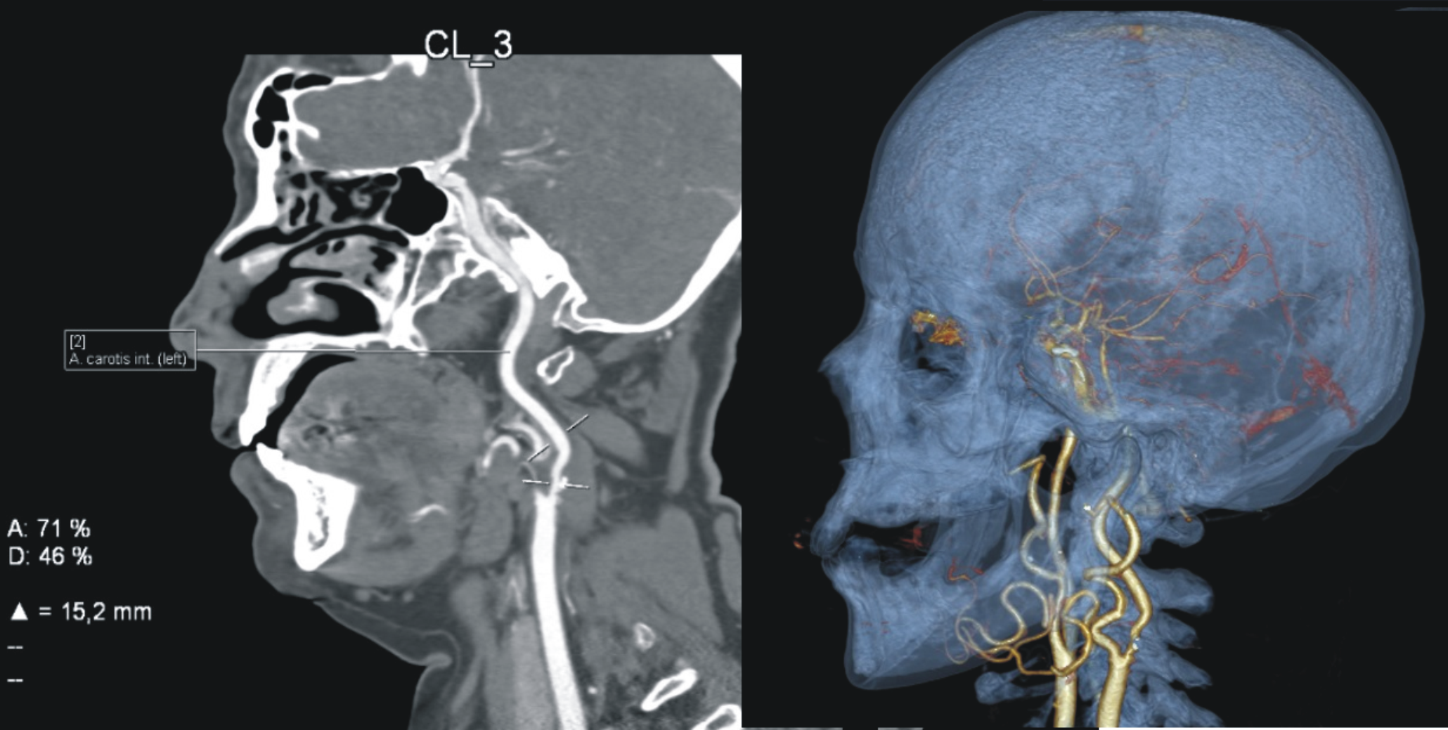 Рис. 1. МСКТ АГ брахиоцефальных артерий. Высокая бифуркация левой общей сонной артерии. Стеноз левой внутренней сонной артерии 71 % (NASCET)
