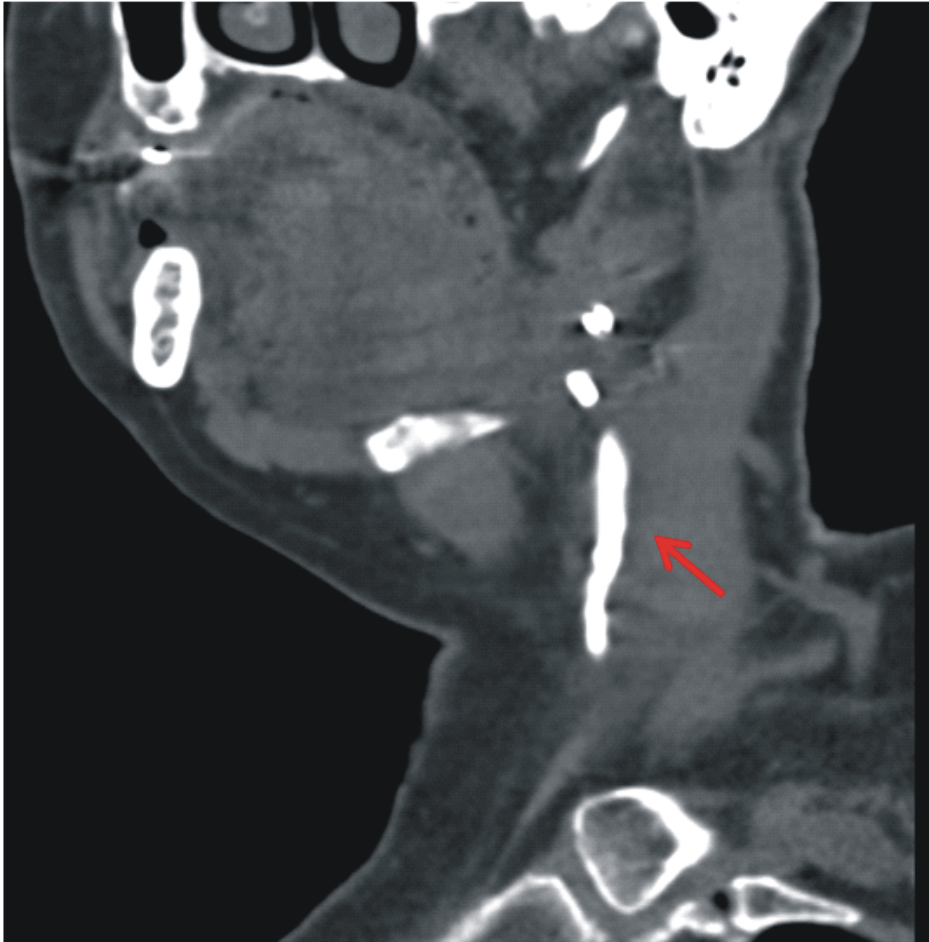 Рис. 2. МСКТ мягких тканей шеи с фистулографией. Стрелкой указан свищевой ход, заполненный контрастным веществом