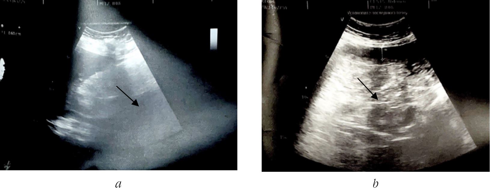 Fig. 1. Ultrasound signs of the presence of limited accumulations of anechoic content: a – in the left flank region; b – in the left hypochondrium