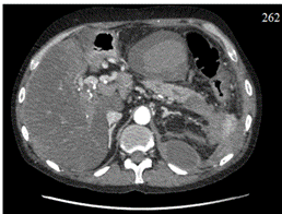 After surgery the patient was diagnosed with severe acute pancreatitis (Atlanta, 2012) complicated by mixed subtotal pancreatic necrosis, dense parapancreatic infiltrate, widespread enzymatic serous-hemorrhagic peritonitis, multiple organ dysfunction syndrome (MODS) with predominant hepatic and renal failure (qSOFA score of 2)). toxic hepatitis. The concomitant disease was an exacerbation of chronic gastroduodenitis.