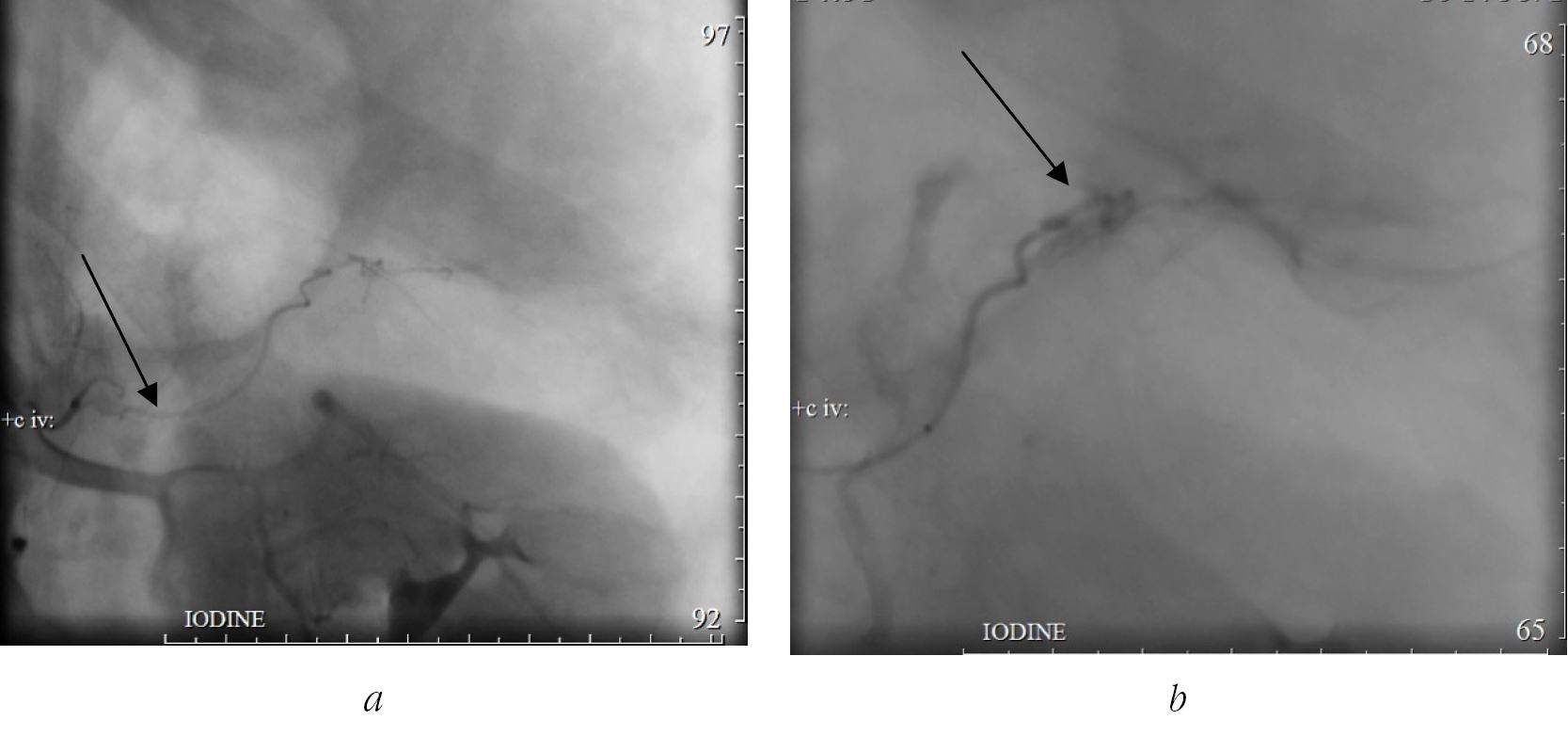 Fig. 3. X-ray endovascular embolization of the aberrant artery lumen: a – pathological branch of the splenic artery feeding the area of the formed pseudocyst; b – embolization of the artery with PVA particles