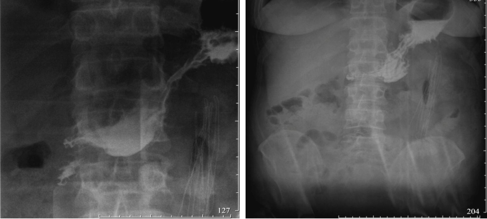 On the 57th day after surgery, the gastric fistula closed. According to the results of X-ray examination of the stomach with a water-soluble contrast agent, no extra contours of the contrast substance were detected. The contrast entered the duodenum in small portions (Fig. 4).