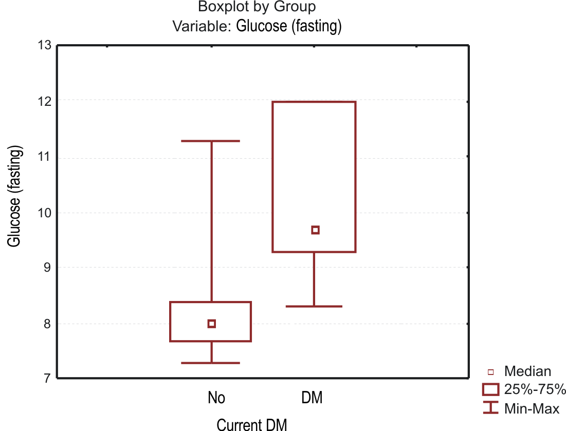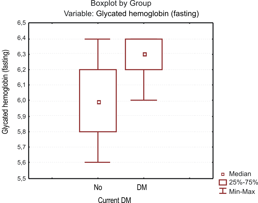 By the time of outpatient consultation with an endocrinologist, 4–6 months after hospitalization, the patients were not taking DPP-4 inhibitor therapy or metformin. After additional analysis, the patients’ condition was reclassified. By this time, T2DM was diagnosed in two patients from subgroup 1A and 10 from subgroup 1B (c2 = 8.2; p = 0.004). In patients with currently confirmed T2DM (n = 12), during hospitalization, the values of HbAlc, fasting plasma glucose, and BMI were significantly higher compared to the corresponding data for those who maintained the prediabetes state (n = 34; p < 0.05) (Figs. 1–3). In patients with persistent prediabetes, the median HbAlc values were 6.0 (5.8–6.1)%, fasting plasma glucose values were 8.0 (7.7–8.2) mmol/l, BMI were 34 (32–35) kg/m2, versus 6.35 (6.2–6.4)%, 10.25 (9.4–11.1) mmol/l, and 35.5 (34.5–37) kg/m2 (p < 0.05), respectively (Figs. 1–3).