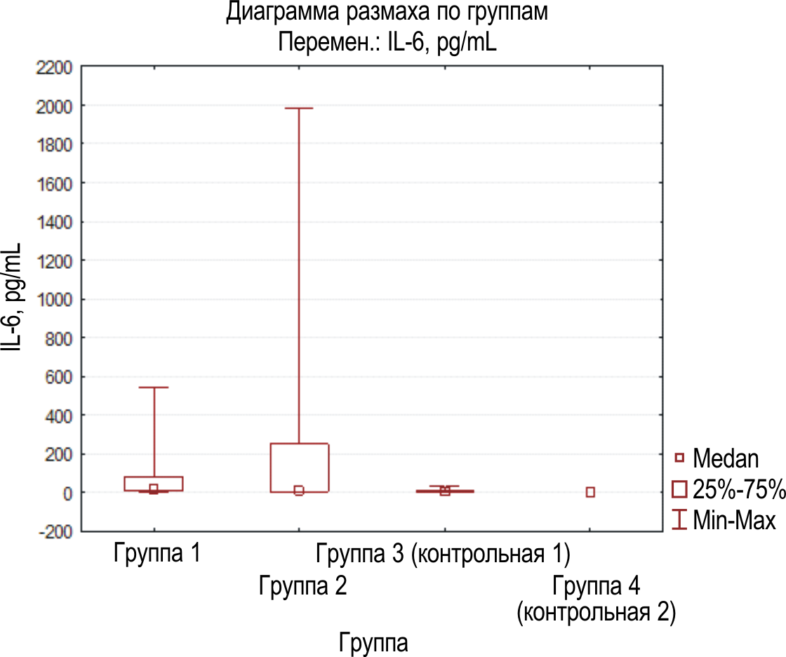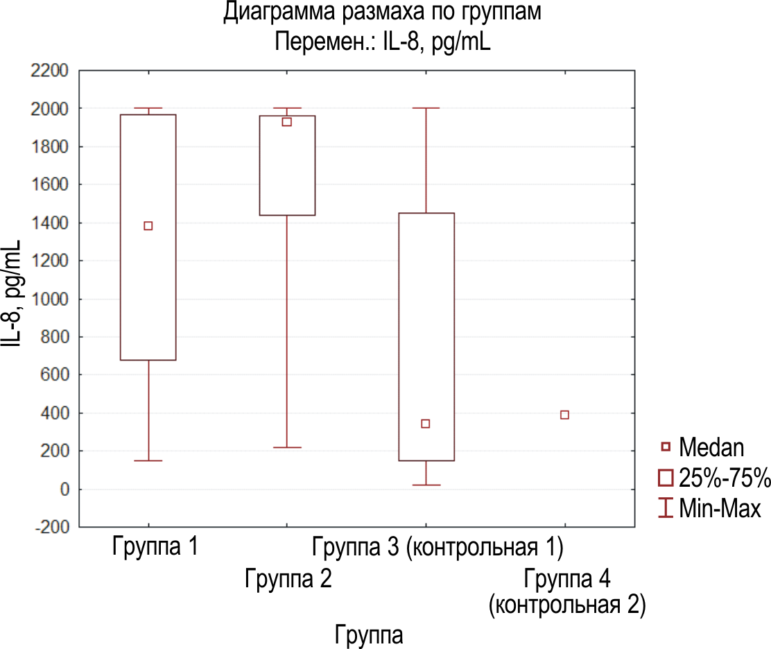 При этом результаты уровня содержания цитокинов РЖ группы 4 (контроля) составляли: IL-1b – 0,00 (0,00–1,30) пг/мл, IL-6 – 0,00 (0,00–0,70) пг/мл, IL-8 – 386,2 (287,8–538,9) пг/мл и TNF-a – 0,0 (0,0–0,0) пг/мл [15; 16].