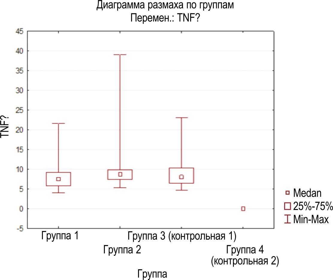 Рис. 3. Бокс-график сравнительного сопоставления уровня содержания TNF-a в исследуемой биологической жидкости обследуемых лиц