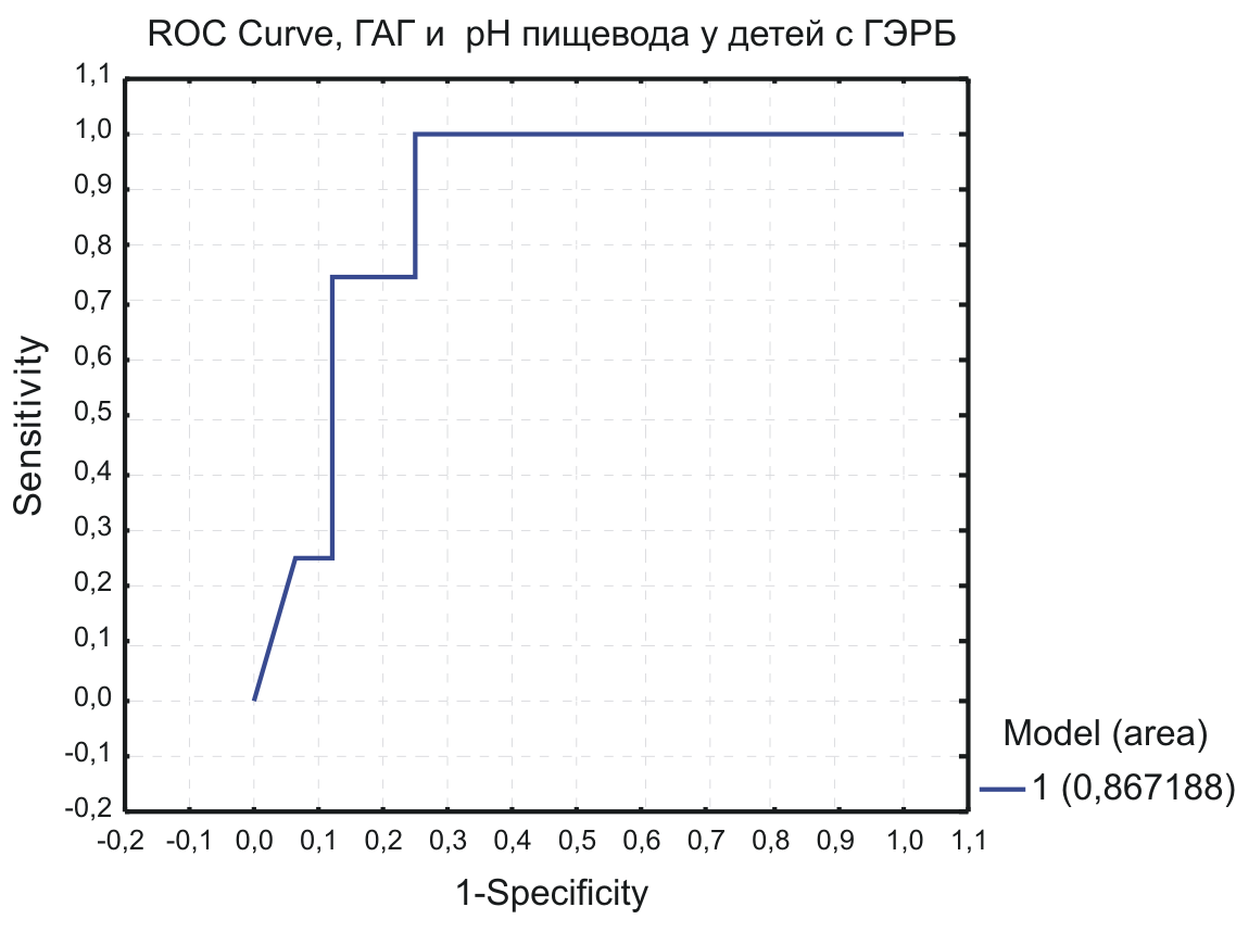 Рис. 1. ROC-кривая взаимосвязи концентрации ГАГ в желудочном соке и рН пищевода у детей с ГЭРБ