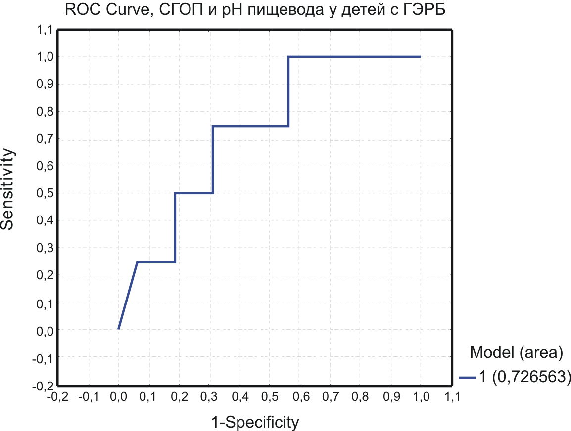 Рис. 2. ROC-кривая взаимосвязи концентрации СГОП в желудочном соке и рН пищевода у детей с ГЭРБ