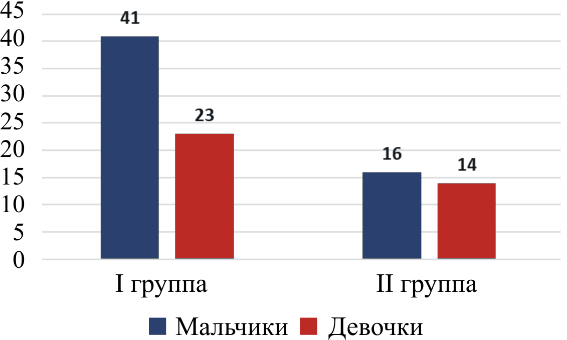Средний возраст исследуемых детей был сопоставим в обеих группах и составил 8 [7–9] лет, p = 0,369. Соотношение мальчиков и девочек в I группе – 2:1, а во II – 1:1 (рисунок).