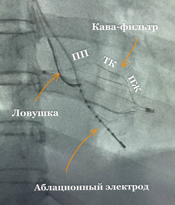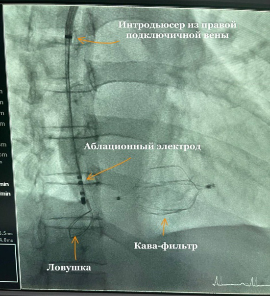 Техника выполнения операции. Выполнена пункция левой подключичной вены, установлен интродьюсер, доведен до уровня правого предсердия. Далее по интродьюсеру был проведен аблационный электрод, чтобы зацепить КФ и подтянуть назад в правое предсердие, однако множественные попытки не дали особого результата, так как фильтр был фиксирован в правом желудочке. Было решено провести десятиполюсный управляемый катетер в правый желудочек и ловушку, после чего была выполнена фиксация КФ (рис. 3) и ее тракция, при этой манипуляции отмечались противодействие тракции и желудочковые аритмии, которые купировались медикаментозно. В результате аккуратными круговыми движениями удалось выполнить смещение КФ в полость правого предсердия, в данной позиции КФ был зафиксирован. Далее выполнена пункция правой подключичной вены, по ней был проведен интродьюсер до правого предсердия для правого коронарного катетера и ловушки. Ловушкой был зафиксирован кончик кава-фильтра и аккуратно удален через правую подключичную вену вместе с интродьюсером (рис. 4).