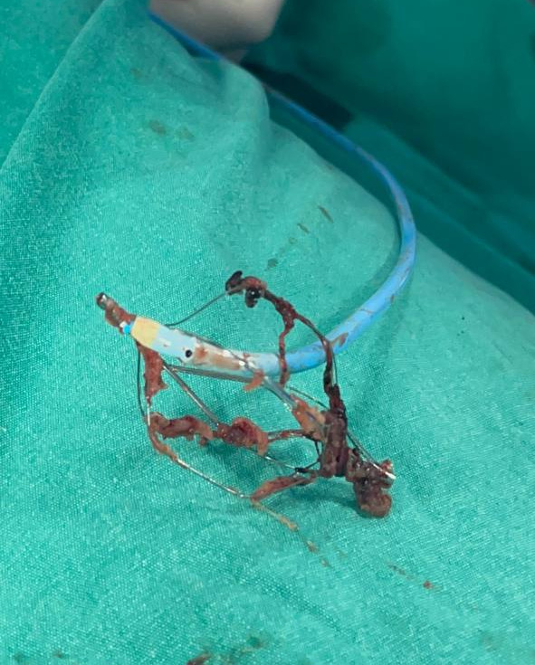 В анамнезе у пациента восемь месяцев назад – поставка КФ. При тщательном обследовании пациента была выявлена дислокация КФ в правые отделы сердца. Попытка эндоваскулярной эксплантации КФ была безуспешной, в связи с чем потребовалось хирургическое вмешательство в объеме экстракции КФ и пластика трикуспидального клапана [23].