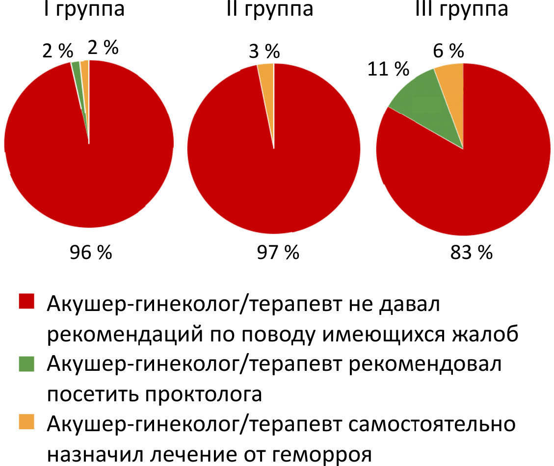 Акушер-гинеколог/ терапевт самостоятельно назначил лечения от геморроя | 2 (1,8) | 2 (3,1) | 2 (5,6) | p1 = 0,554 p2 = 0,218 p3 = 0,552 | |