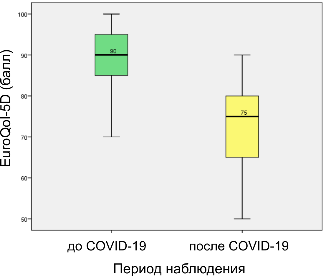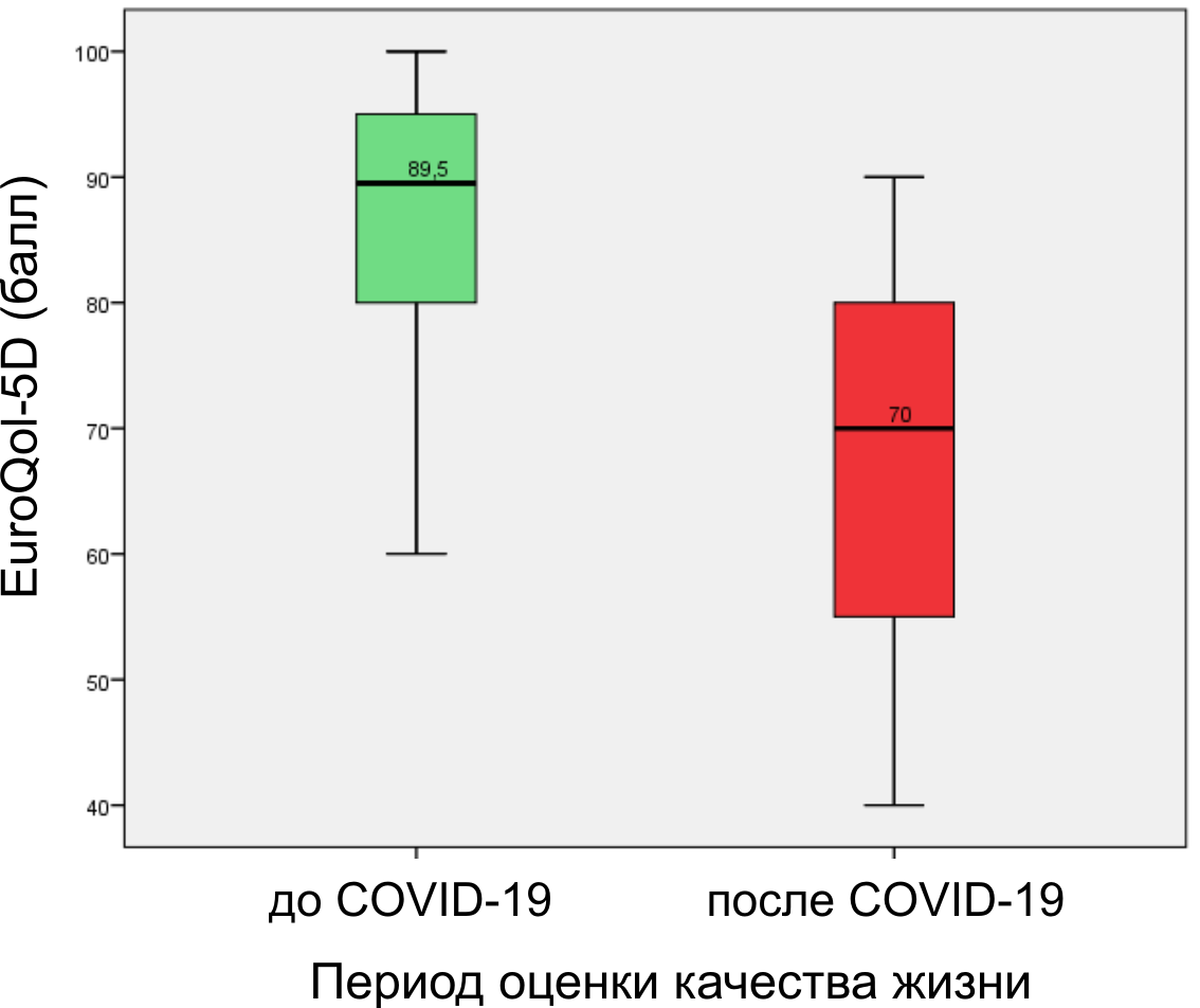 Результаты. У пациентов с ХОБЛ до перенесенного COVID-19 среднее значение общего балла по визуально-аналоговой шкале составило 89,5 [83,8; 95], а после COVID-19 – 70 [64,5; 80]. Установлено, что в постковидном периоде 91 % лиц с ХОБЛ отмечали ограничения подвижности, 33,3 % – испытывали затруднения при уходе за собой, 65,4 % пациентов не могли заниматься привычной деятельностью, 60,3 % ощущали выраженную боль или дискомфорт, а у 29,5 % пациентов наблюдалась сильно выраженная тревога или депрессия. У пациентов с астмой до перенесенного COVID-19 среднее значение балла составило 90 [88,4; 91], а после – 75 [70,2; 80,2]. В постковидном периоде 71,2 % пациентов отмечали затруднения в передвижении, а 64,4 % – при уходе за собой, 54,8 % не могли заниматься привычной деятельностью. При этом 78,1 % пациентов испытывали боль или дискомфорт, а у 58,9 % установлена умеренная тревога или депрессия.