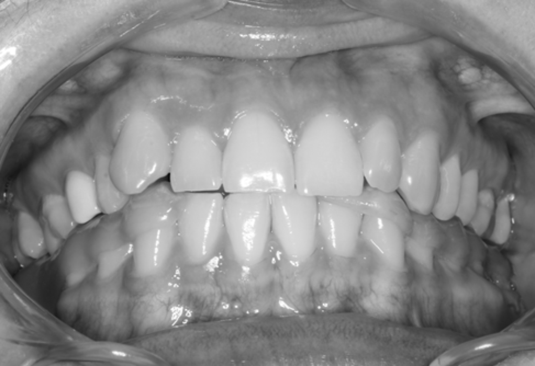 Subsequent treatment was performed by an orthodontist using fixed equipment using a bracket system. Wearing an occlusion splint continued until the bracket system was placed on the teeth of the lower jaw, at which time it was replaced by composite overlays in the projection of the first molars of the upper jaw.