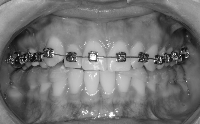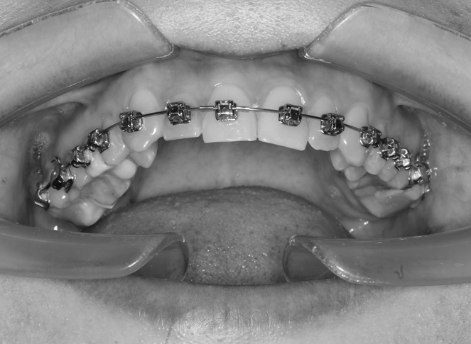 The results of the conducted studies allowed us to move on to orthodontic treatment, which consisted of the sequential application of the bracket system first to the teeth of the upper jaw; wearing of the occlusal splint continued at this stage (Fig. 6).