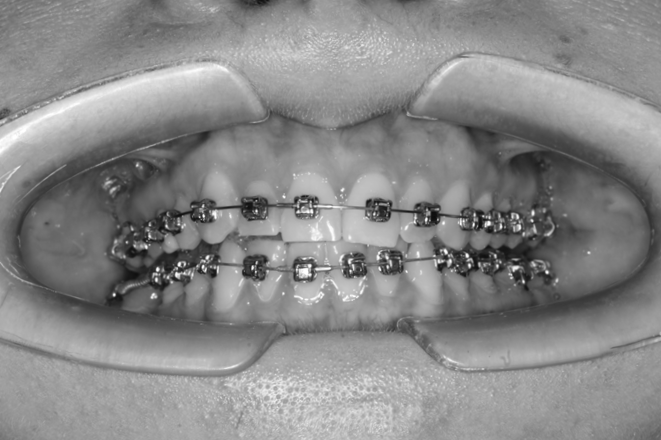 Fig. 7. The stage of applying the brace system to the teeth of the lower jaw