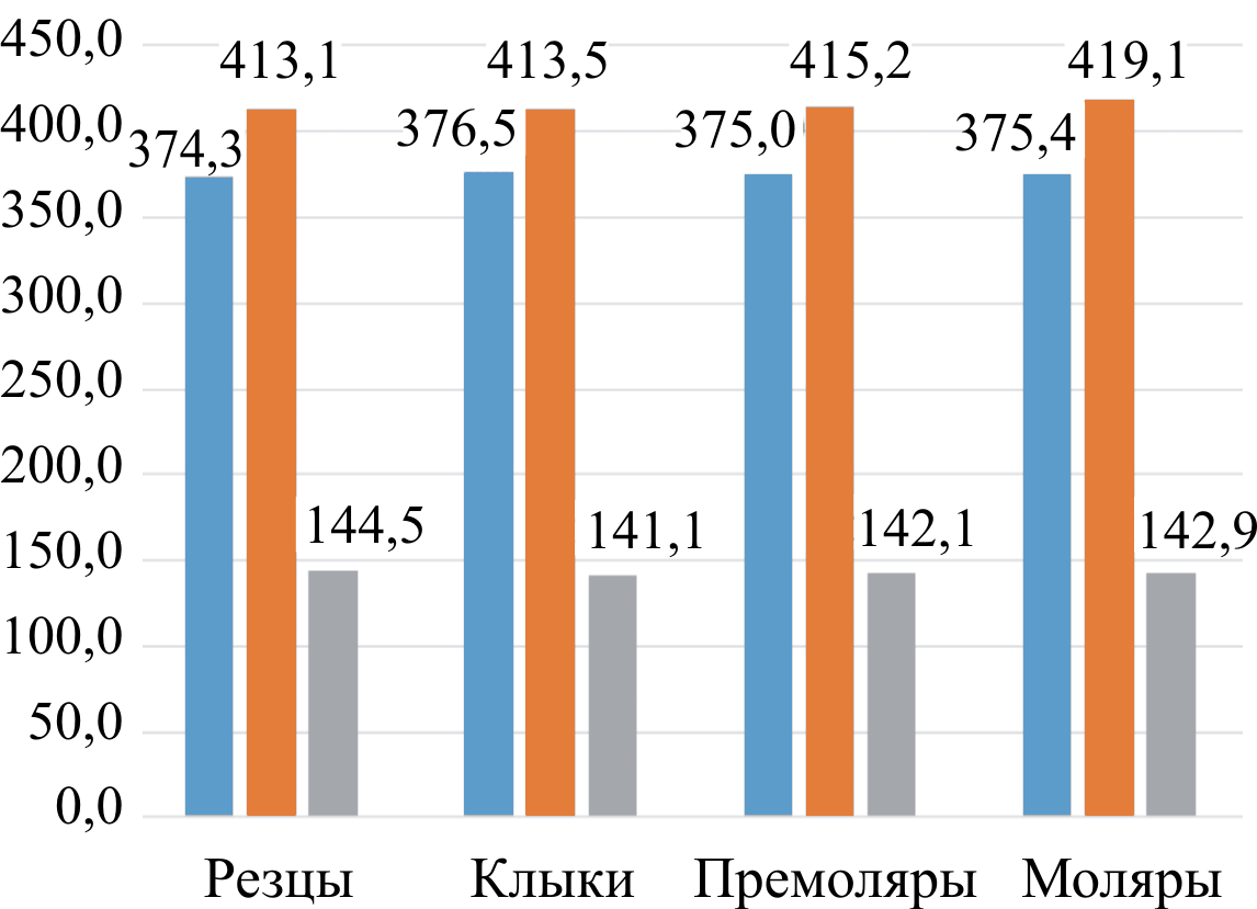 Данное исследование показывает разный уровень минерализации в разных участках зуба как до, так и после лучевого воздействия. Как видно из результатов исследования, имеются различия в разных участках поверхности твердых тканей зубов (экватор, шейка, режущий край) (см. рис. 3.) Наименьшая минерализация согласно данным (интенсивность Рамана) имеется в области шейки зубов (резцы -y = 145 ± 1,5, х = 963 см-1; клыки -y = 141 ± 1,1, x = 963 см-1; премоляры y = 142 ± 1,8, х = 963 см-1; моляры -y = 143 ± 1,3, x = 963 см-1), средняя в области режущего края и окклюзионной поверхности (резцы -y = 374 ± 1,7, х = 963 см-1; клыки -y = 377 ± 1,3, x = 963 см-1; премоляры y = 375 ± 1,2, х = 963 см-1; моляры -y = 375 ± 1,1, x = 963 см-1) и максимальная в области экватора (резцы -y = 413 ± 1,1, х = 963 см-1; клыки -y = 414 ± 1,9, x = 963 см-1; премоляры y = 415 ± 1,7, х = 963 см-1; моляры -y = 419 ± 1,6, x = 963 см-1). В то же время в каждой из областей уровень минерализации не изменяется после лучевого воздействия вне зависимости от дозы.