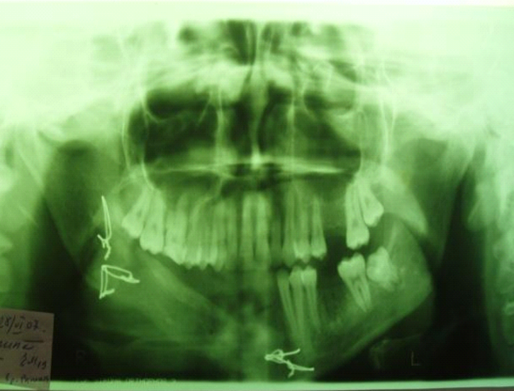 On the control orthopantomogram, an implant is fixed in the area of the defect of the lower jaw on the right, the fixation is satisfactory. The shadows of metal-density ligature sutures are visible in the area of the right lower jaw branch and the chin section of the lower jaw (Fig. 3).