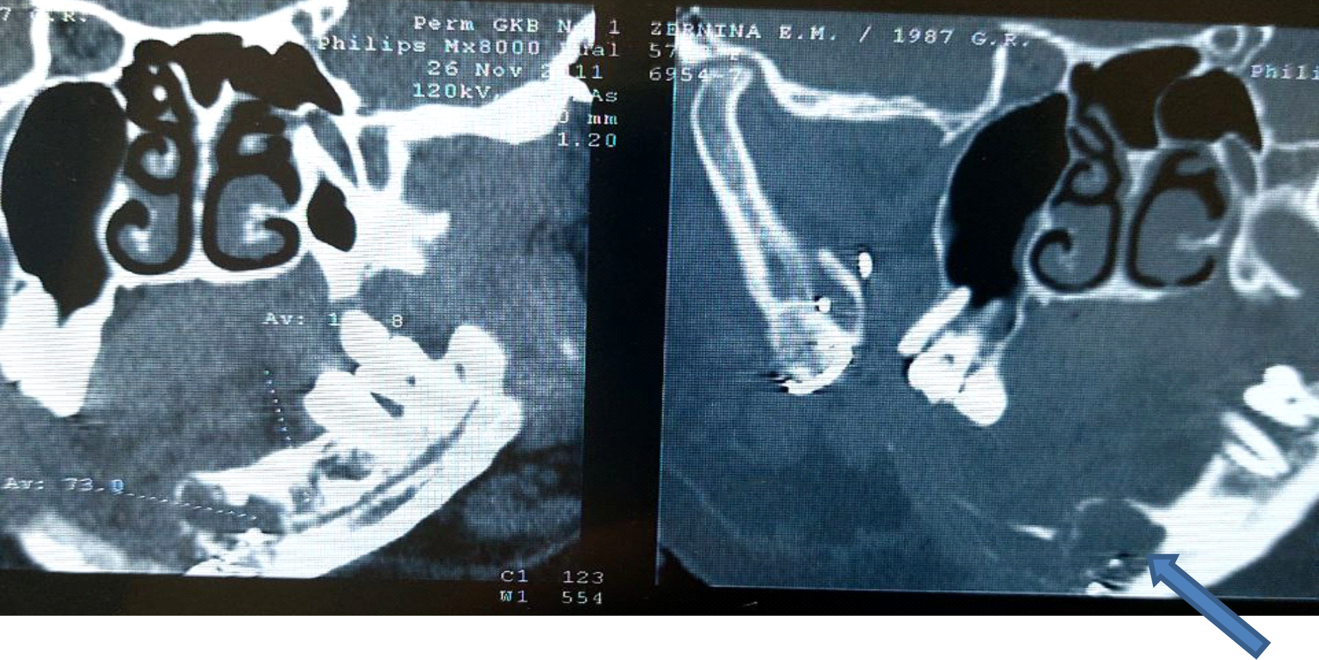 At the stage of choosing surgical treatment options, autoplasty, replacement of the postoperative defect with a reconstructive plate or an orthotopic implant made of carbon-carbon material "Uglekon-M" were considered. Taking into account the properties of implant systems made from the “Uglekon-M" material, in particular high biological inertness, dimensional stability over time, compliance of the structure and physical and mechanical characteristics with the native bone indicators, the possibility of restoring the shape of the face, and the absence of the need for additional surgical interventions, the choice was made in favor of this implant material.