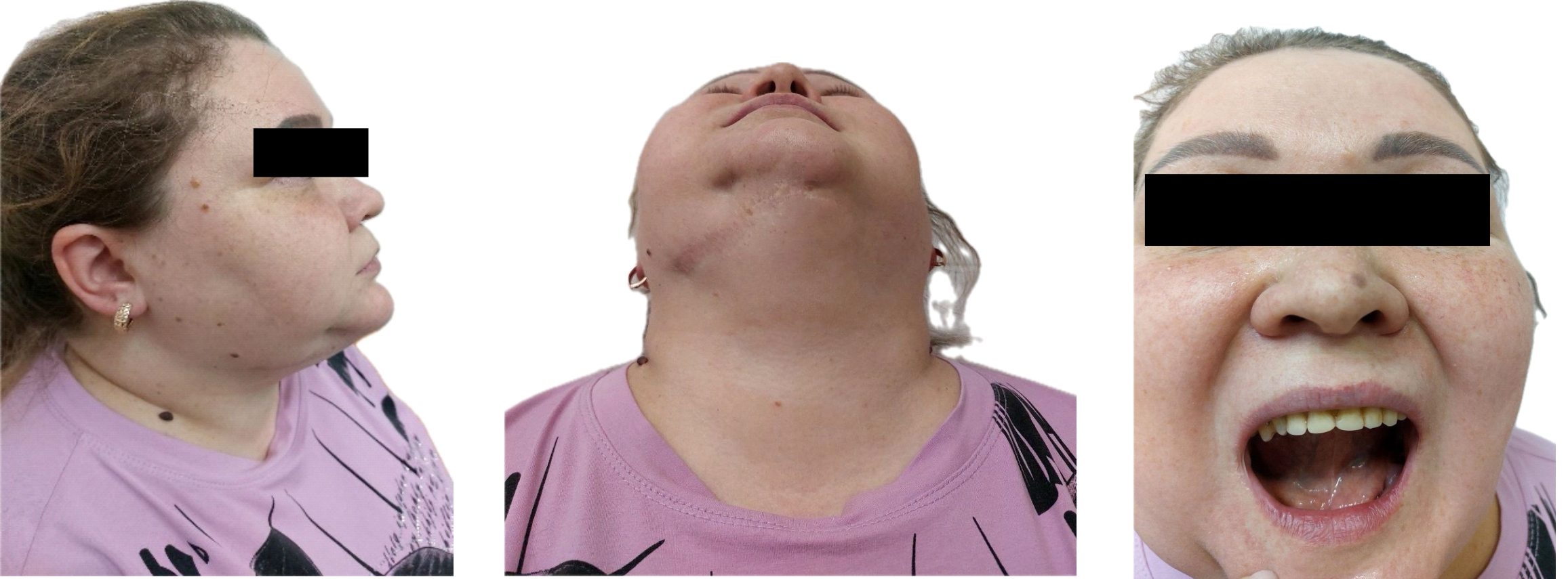 In December 2023, the patient was called to the Clinical Hospital of Perm State Medical University for a follow-up examination. Upon examination, the facial configuration and shape of the lower jaw were satisfactory, the scar in the submandibular region was pink, smooth, and even. The movements of the temporomandibular joints are synchronous, smooth, and painless. The mouth opens freely, up to 4.0 cm. In the oral cavity: the crown of tooth 3.7 is completely destroyed, its roots are pigmented. On the lingual side in the projection of tooth 3.7, a bulge of the outer cortical plate of a round shape with a diameter of up to 1.5 cm was found, painless upon palpation. Percussion of tooth 3.7 is moderately painful. The mucous membrane above the neoplasm is not changed in color, there is a pale pink scar in the area of the implant. The midline is located centrally, the defects of the dental arches are replaced by removable dentures for the upper and lower jaw. When palpating the lower jaw, no mobility is determined in the area of the bone-implant junction. The patient is satisfied with the achieved treatment result (Fig. 7).