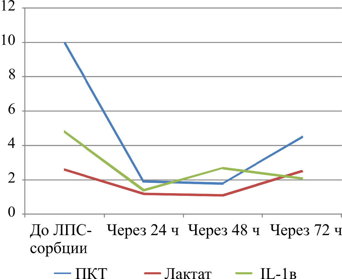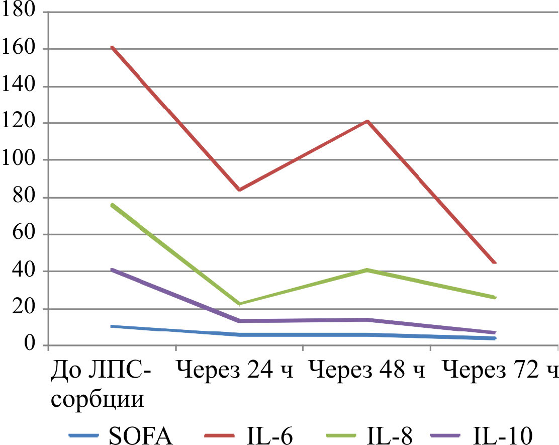 Результаты. После ЛПС-сорбции медиана баллов по шкале SOFA значимо снизилась до 5 (р = 0,00). Отмечено достоверное снижение уровней креатинина, лактатдегидрогеназы, прокальцитонина, интерлейкинов 1b, 8, 10, тенденция к снижению содержания С-реактивного белка, пресепсина, интерлейкина 6, фактора некроза опухоли, активности эндотоксина. Максимальный эффект ЛПС-сорбции с применением колонок «Эфферон ЛПС» возникал после первого сеанса. После второй процедуры тяжесть по шкале SOFA, активность эндотоксина, уровень прокальцитонина и лактата снижались незначительно. Через 72 ч содержание прокальцитонина и лактата имело тенденцию к увеличению.