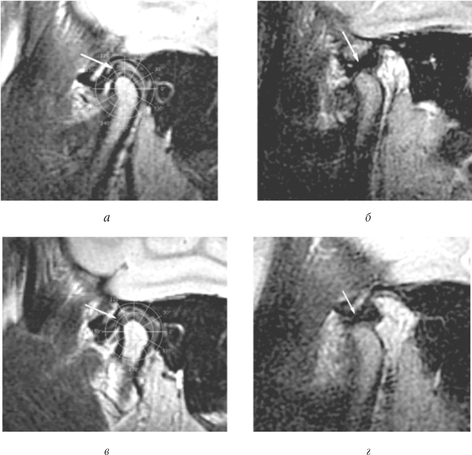 Рис. 3. Пациентка 1. Магнитно-резонансная томография височно-нижнечелюстного сустава справа (a – в положении центральной окклюзии; б – с широко открытым ртом) и слева (в – в положении центральной окклюзии; г – с широко открытым ртом)