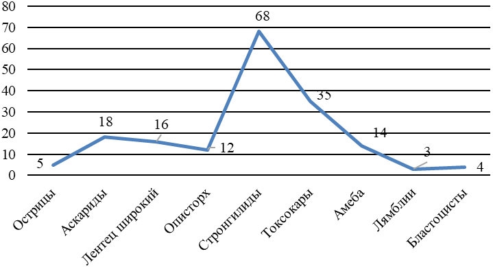 Положительные находки в виде гельминтов были представлены в большинстве случаев личинками Strongyloides stercoralis – 44,2 % (68 проб) и яйцами Toxocara canis – 22,7 % (35 проб). Кроме того, отмечались положительные находки в виде яиц Ascaris lumbricoides – 11,7 % (18 проб), Diphyllobothrium latum – 10,4 % (16 проб), Opisthorchis felineus – 7,8 % (12 проб) и Enterobius vermicularis – 3,2 % (5 проб).