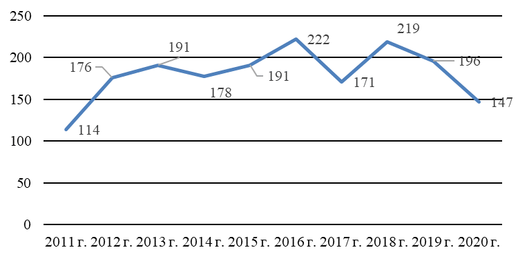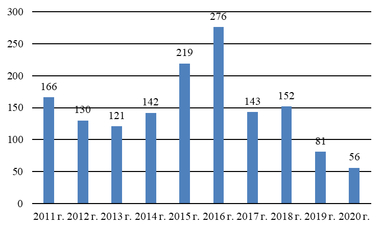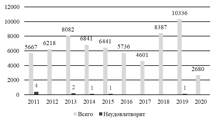 Рис. 4. Число исследованных/неудовлетворительных проб смывов, отобранных за 2011–2020 гг.
