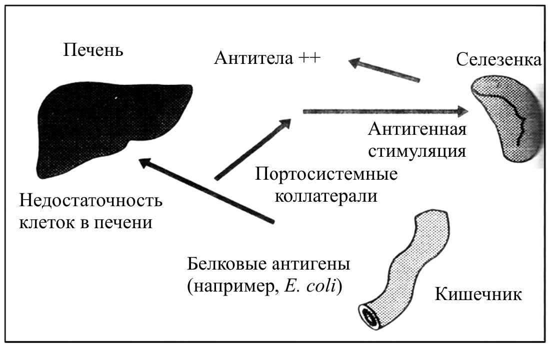 На фоне портальной гипертензии нарушается процесс поглощения и инактивации белковых антигенов из кишечника клетками Купфера и пораженными гепатоцитами. Кроме того, эти антигены при развитии портосистемных коллатералей на фоне портальной гипертензии и прохождении через внутрипеченочные шунты, образующиеся вокруг узлов в печени, стимулируют выработку антител / гамма-глобулинов, особенно в селезенке [4].