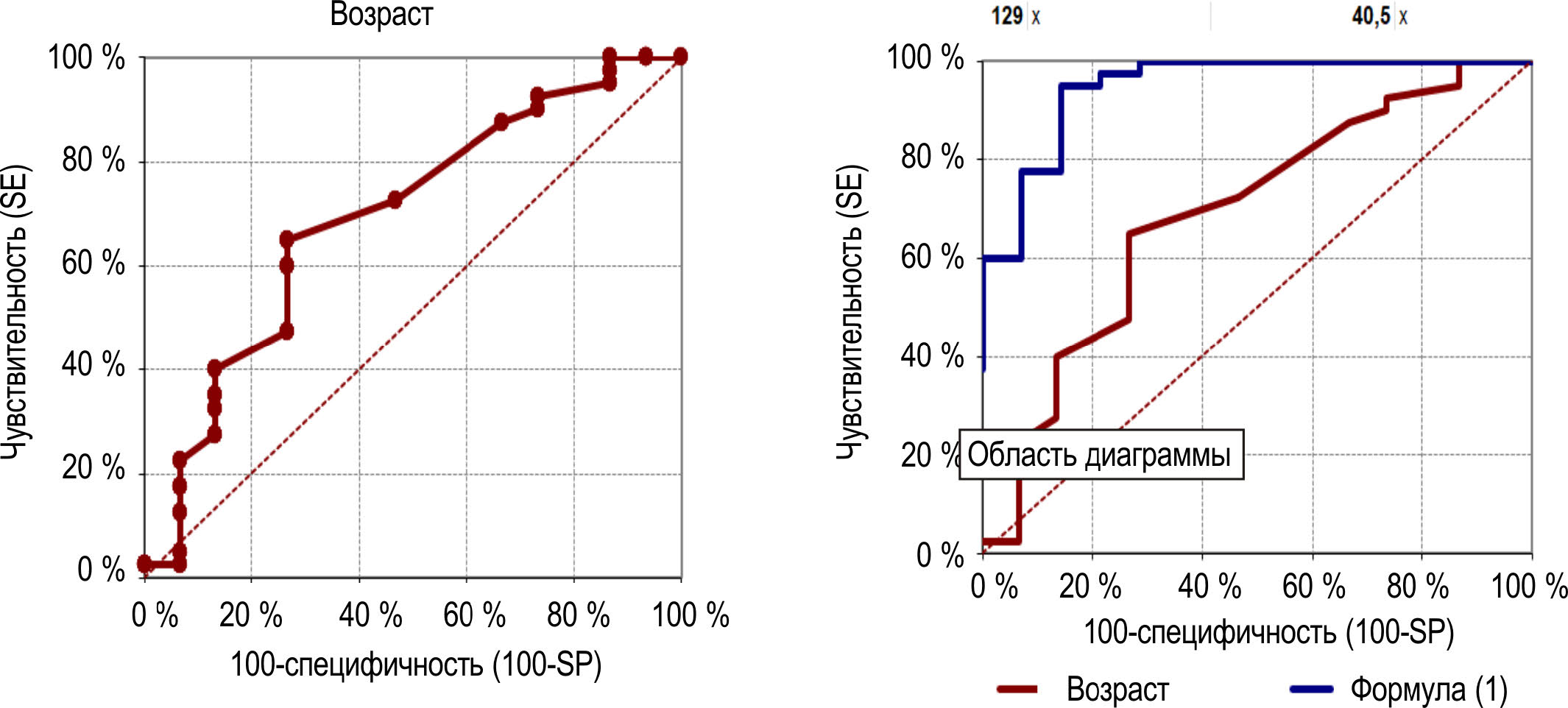 Рис. ROC-кривая для модели, идентифицирующей доброкачественную опухоль яичника по возрасту пациентки и интегральному показателю, для формулы (1) AUC = 0,95; для признака «возраст» AUC = 0,69