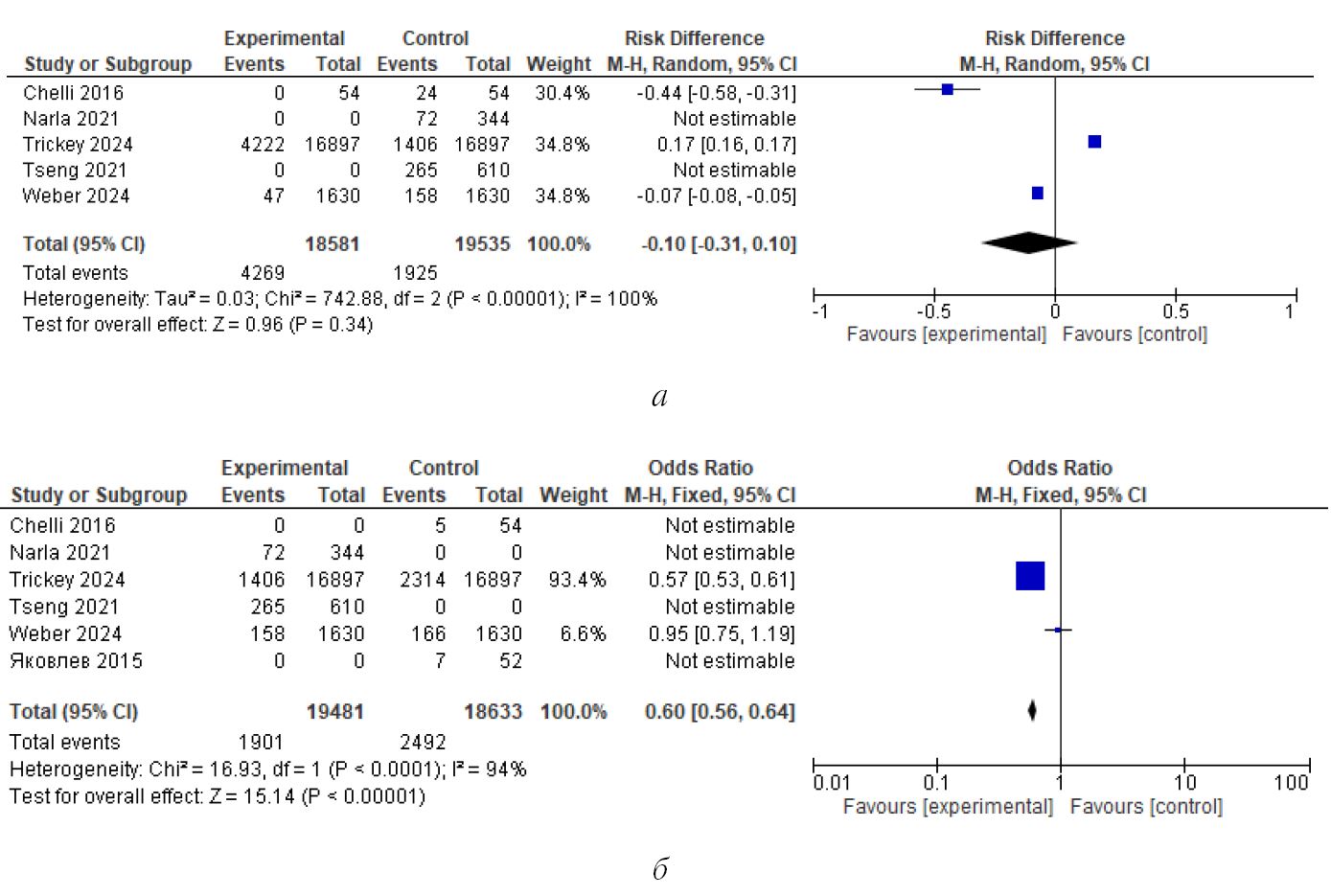 2. Рис. Сравнительный метаанализ причин смерти ВИЧ-инфицированных: а – от СПИД и оппортунистических инфекций и смерть от сердечно-сосудистых заболеваний; б – от сердечно-сосудистых заболеваний и от онкопатологии