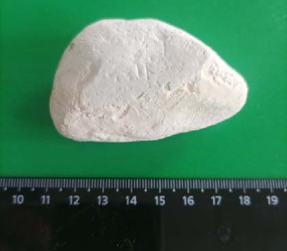 Учитывая парез желудка (стойкий гастростаз), решено выполнить лапаротомию, ревизию, при необходимости вскрытие абсцессов. При операции удален секвестр из области головки поджелудочной железы 2,0 ´ 3,0 см. Перистальтика кишечника вялая. При дальнейшей ревизии в просвете желудка обнаружено плотное инородное тело, свободно смещаемое. Выполнена гастротомия, из полости желудка извлечено инородное тело по типу камня, светлого серо-желтого цвета размерами 6,0 ´ 4,0 ´ 4,0 см – наиболее вероятно слежавшийся сульфат бария (окаменевшая бариевая взвесь) (рис. 2).