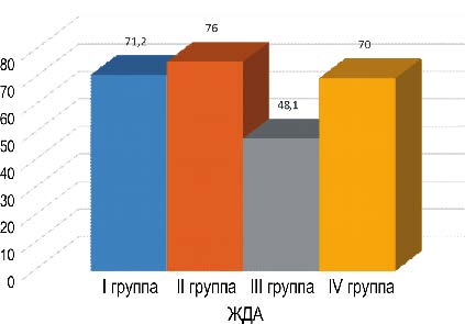 При проведении анализа установлено, что практически у всех пациенток в сравниваемых группах диагностированы анемические состояния, которые повышают риск материнских и перинатальных осложнений: в I группе – у 37 женщин (71,2 %); во II – у 38 (76,0 %); в III – у 26 (48,1 %) и в IV – у 21 (70,0 %), что статистически значимо (H = 13,341; p < 0,05) (рис. 1).