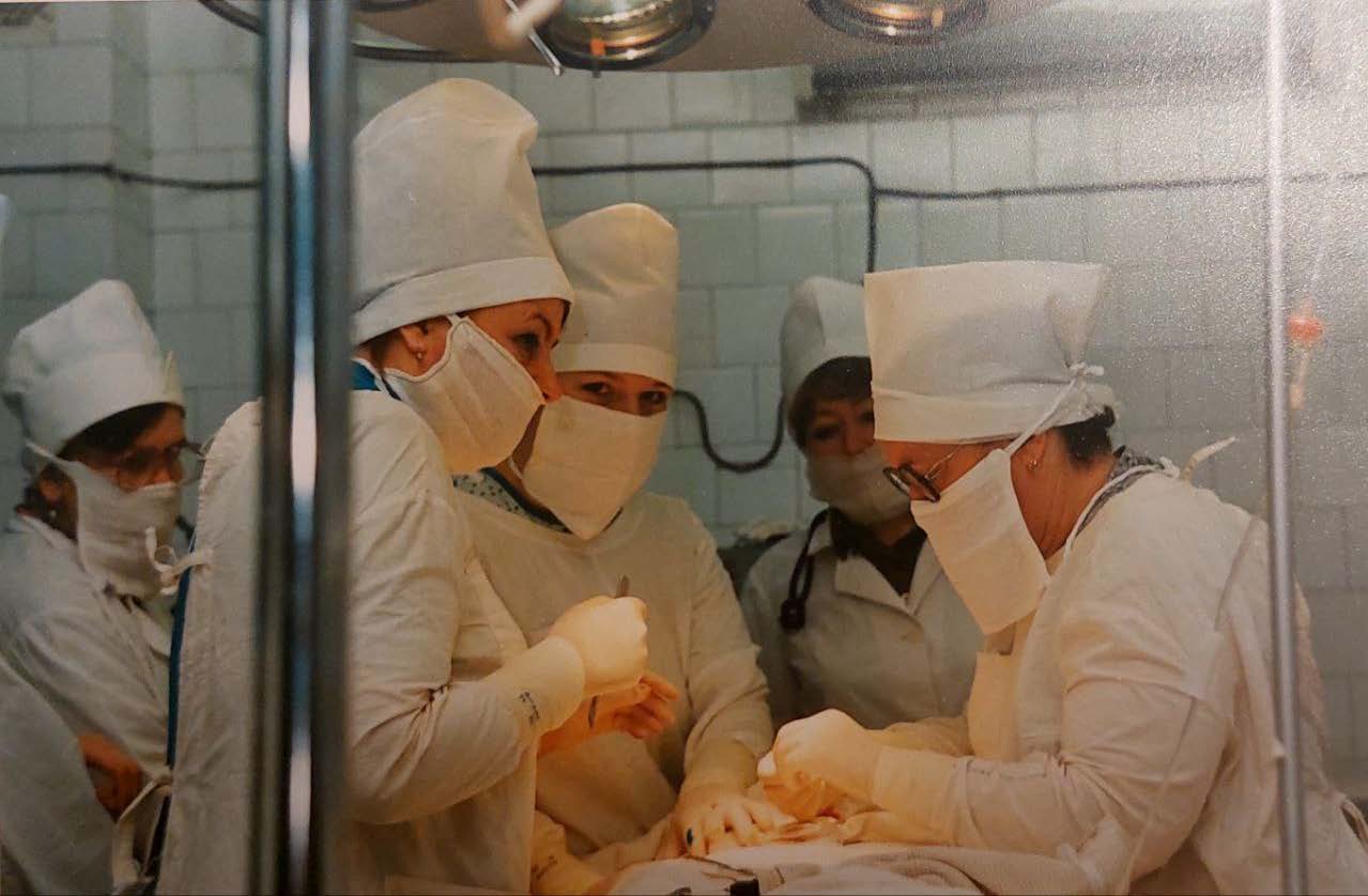 Рис. 4. Профессор Ф.И. Кислых в операционной (ассистируют Н.В. Попова, С.И. Рапекта)