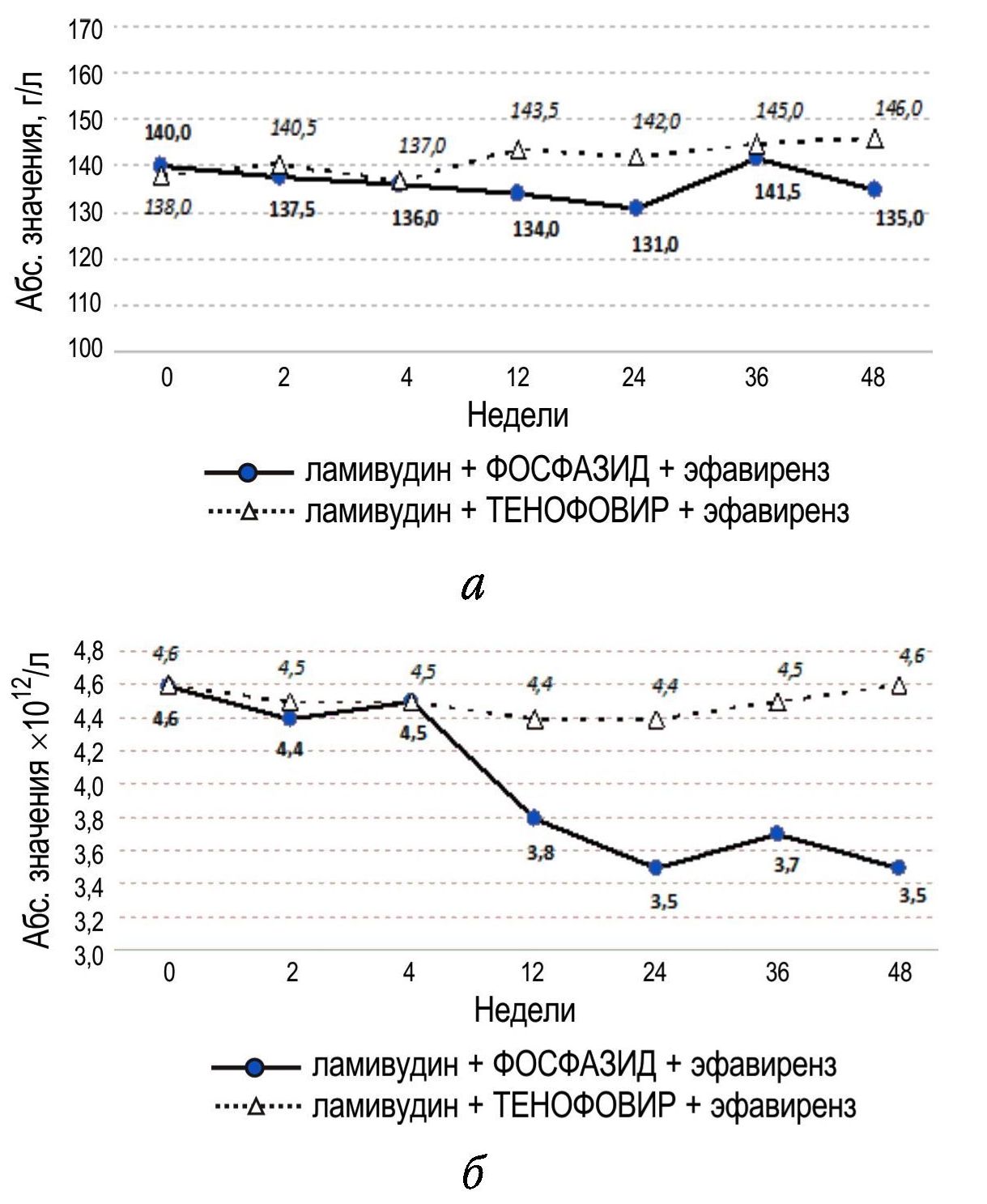 На фоне АРТ у обследуемых группы с применением фосфазида наблюдалось снижение количества эритроцитов начиная с 12-й недели (у 7 пациентов) до (3,3–3,9)·1012/л (Ме = 3,8), на 24-й неделе (у 6 пациентов) до (3,1–3,6)·1012/л (Ме = 3,5), в 36 недель (у 3 человек) до (3,2–3,5)·1012/л (Ме = 3,7), 48 не-дель – у 3 больных до (3,3–3,5)·1012/л (Мe = 3,5) (рис. 2, б).