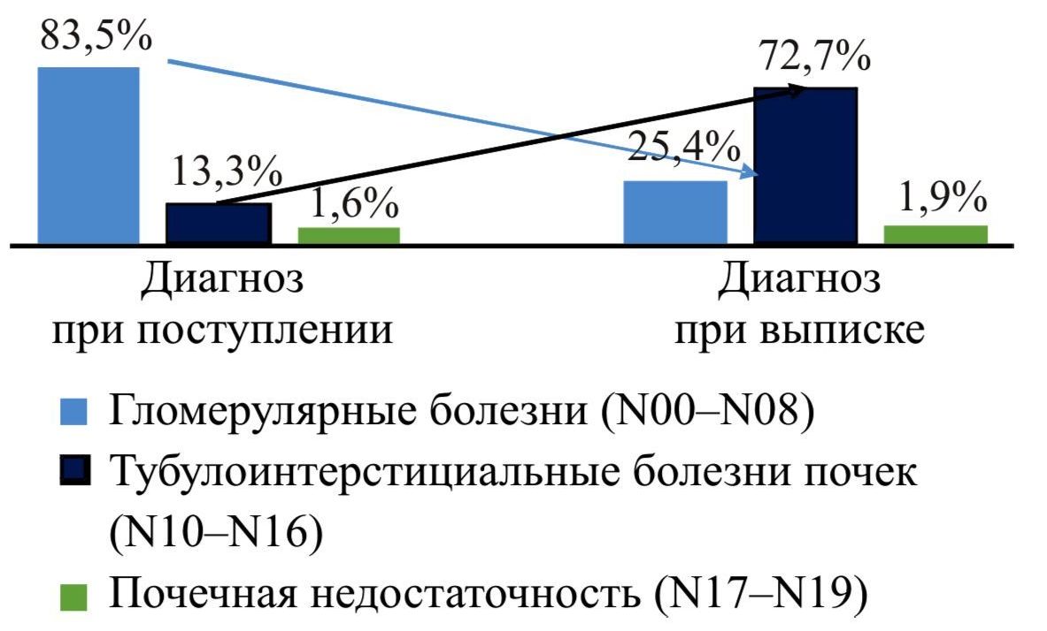 Применение данных датасета включало в себя изучение клинических и антропометрических данных пациентов с гипертензивной (гипертонической) болезнью с преимущественным поражением почек в разном возрасте и с учетом пола. На первом этапе исследования данные датасета позволили определить, что в стационар поступают пациенты в основном с диагнозами нозологической группы «Гломерулярные болезни» (83,5 %), тогда как при выписке диагноз данной нозологической группы встречается только в каждом четвертом случае (25,4 %). В то же время диагнозы нозологической группы «Почечная недостаточность» при поступлении в стационар были установлены только в каждом десятом случае (13,3 %), тогда как при выписке диагноз данной нозологической группы был установлен в 72,7 % случаев (рисунок). Диагнозы нозологической группы «Болезни, характеризующиеся повышенным кровяным давлением» как основной диагноз при поступлении в отделение стационара встречаются редко (1,6 %), но также при выписке устанавливаются несколько чаще (1,9 %) (табл. 1).