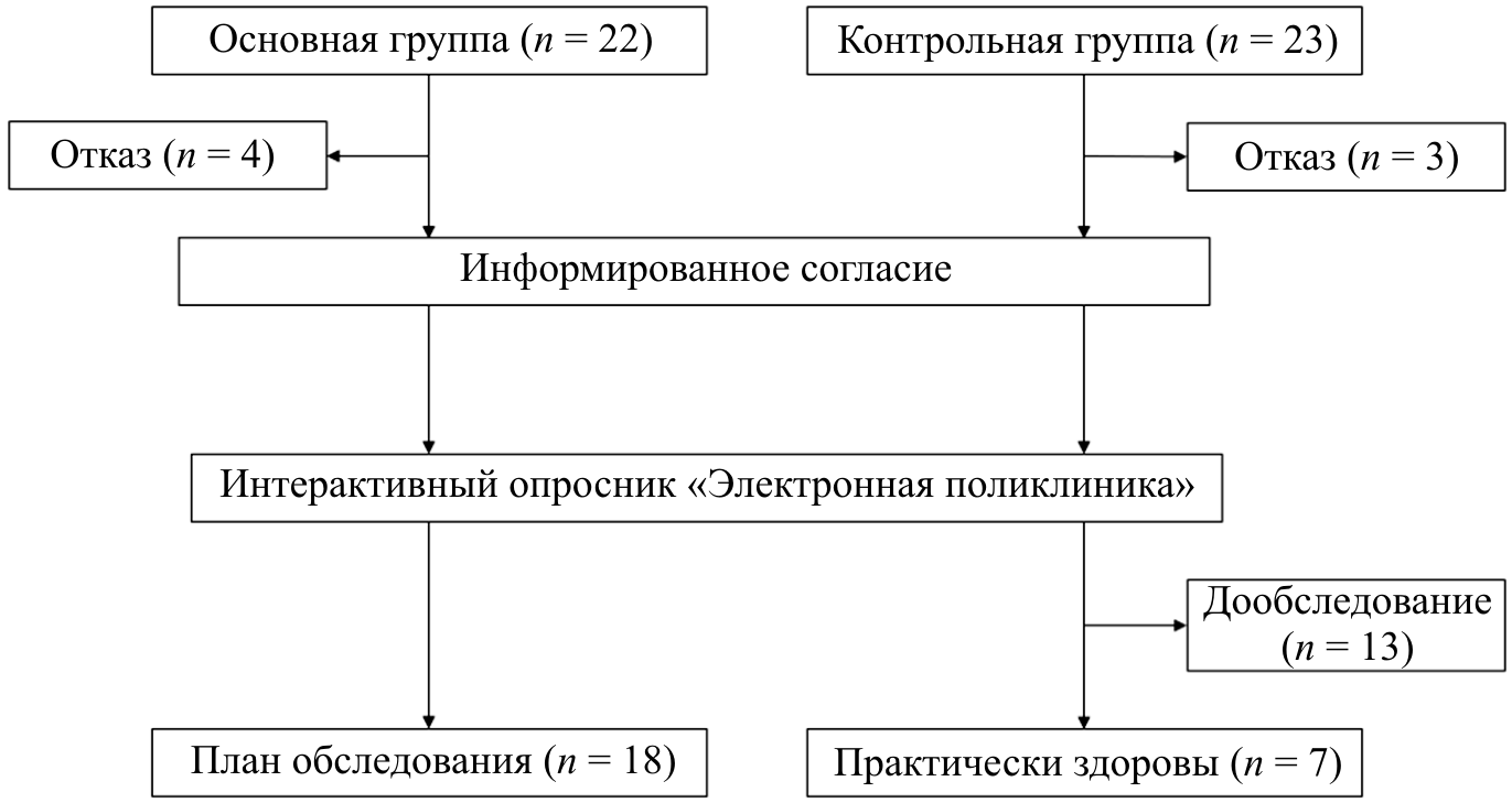 Проведен одномоментный сравнительный анализ данных медицинской документации 18 стационарных больных в возрасте 42–79 лет, из них 8 мужчин и 10 женщин терапевтического отделения ГАУЗ ПК ГКБ № 4, имеющих жалобы на боли в пояснице и / или мочеиспускание преимущественно в ночное время и / или отеки. Сравнительный характер исследования предусматривал обследование группы контроля – семи практически здоровых лиц в возрасте в возрасте от 48 до 66 лет, из них пять женщин и двое мужчин. Дизайн исследования представлен на рис. 1.