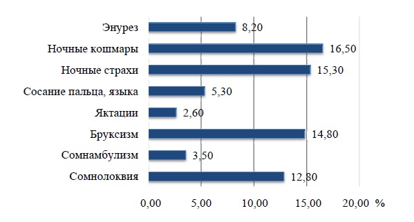 Полученные результаты, характеризующие клинические особенности сна у детей дошкольного возраста, проживающих в г. Перми, имеют некоторые отличия от данных, приведенных в литературе. Так, по данным некоторых авторов, среди парасомний у детей доминируют сноговорение (84 %), частые ночные пробуждения (60 %), бруксизм (45 %), ночные страхи (39 %), реже отмечаются ночной энурез (25 %), трудности засыпания (16 %), храп (14 %), ритмичные движения (9 %), обструктивное апноэ сна (3 %) [10, 14, 17].