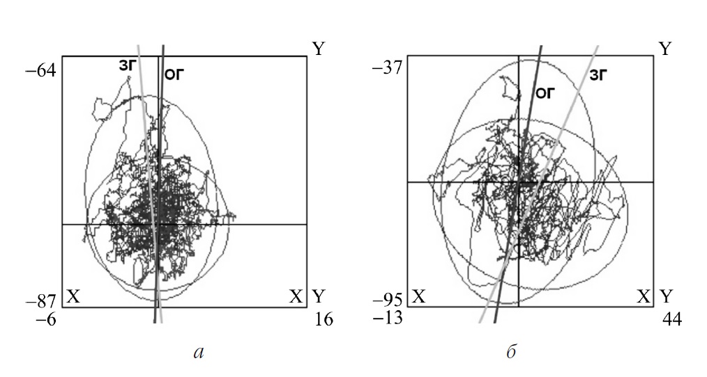 Рис. 1. Величины угла преимущественного направления колебаний центра давления на статокинезиограммах: а – незначительные – у здорового ребенка; б – выраженные – у пациента с идиопатическим сколиозом. Величина Al определяется углом между длинной осью эллипса и сагиттальной плоскостью. ОГ – тест с открытыми глазами, ЗГ – тест с закрытыми глазами