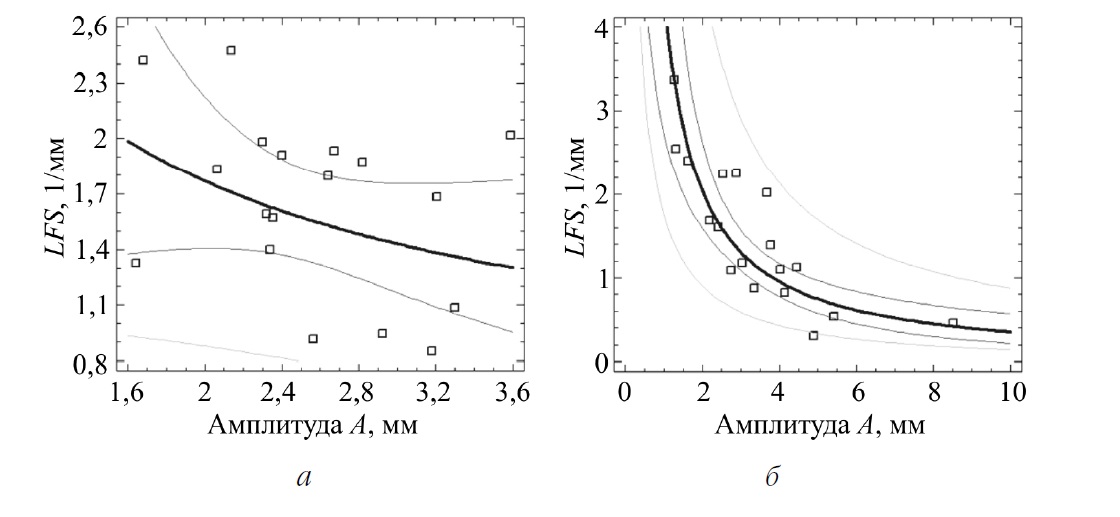Рис. 2. Линия регрессии (жирная) и ее доверительный интервал (тонкие линии) для зависимости параметра LFS статокинезиограмм от амплитуды колебаний А в тесте с открытыми глазами: а – у здоровых детей; б – у пациентов с идиопатическим сколиозом