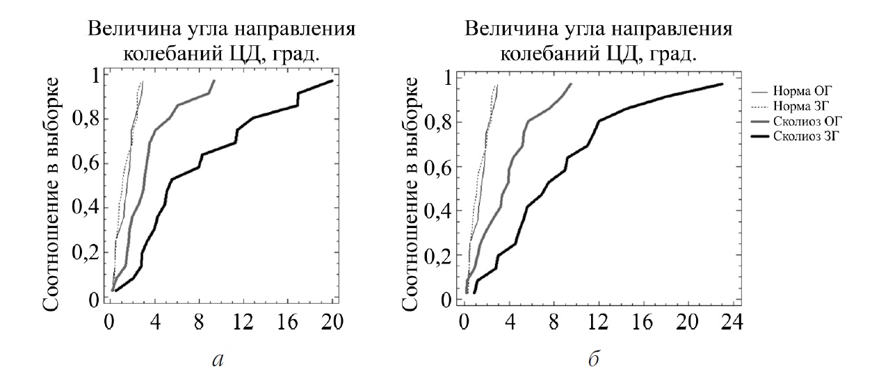 Рис. 3. Графическое отображение величины угла преимущественного направления колебаний Al центра давления на статокинезиограммах здоровых детей и пациентов с идиопатическим сколиозом: а – до; б – после коррекции деформации позвоночника. ОГ – тест с открытыми глазами, ЗГ – тест с закрытыми глазами