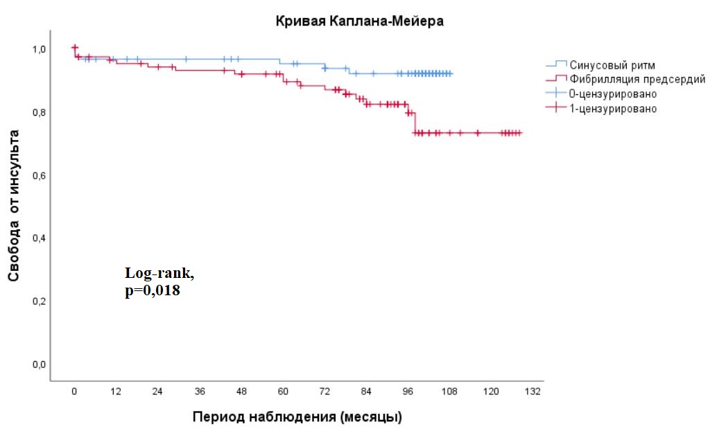 Статистическую обработку материала выполняли с использованием пакета программного обеспечения IBM SPSS Statistics 26 (Chicago,IL, USA). С целью минимизации смещения результатов и обеспечения максимальной сопоставимости групп выполнено их уравнение методом псевдорандомизации (Propensite Score Matching, PSM). Две переменные, которые потенциально могли повлиять на исход, были включены в логистическую регрессионную модель для выполнения PSM: возраст, фракция выброса левого желудочка (ФВ ЛЖ). По указанным двум ковариантам проведена псевдорандомизация. Каждому наблюдению основной группы подбирали пару из контрольной группы, которая имела наиболее близкое значение PS (метод «ближайшего соседа», Nearest Neighborhood 1:1). Значение отрезка PS, составляющее 0,1 от стандартного отклонения логита PS, было достаточным для обеспечения сходства наблюдений в паре по имеющемуся набору кауфандеров. Выполнена проверка всех количественных переменных на тип распределения с помощью критерия Колмогорова – Смирнова. Количественные переменные, имеющие приближенно нормальное распределение, описывали в форме среднего значения и стандартного отклонения (M ± SD), в случае отличного от нормального распределения – в виде медианы (интерквартильный размах 25-й и 75-й процентили), Me (Q1–Q3). Критический уровень значимости при проверке статистических гипотез принимали за 0,05. Время до первого клинического события (летального исхода, инсульта) было оценено с использованием метода Каплана – Мейера. Одномерный или многомерный регрессионный анализ Кокса использовали для определения независимых факторов риска наступления конечных точек.