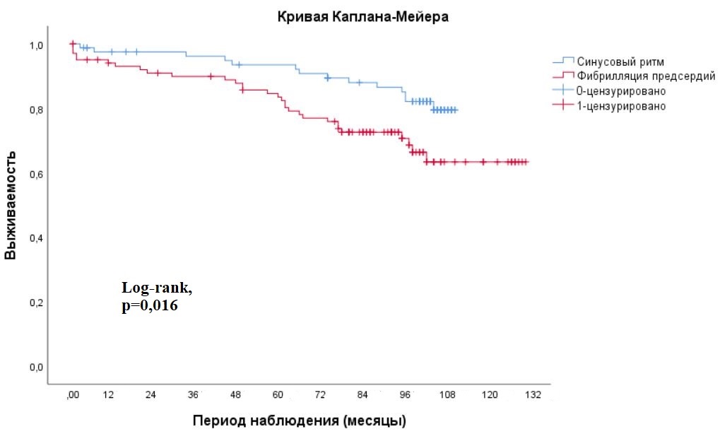 Results. The time spent in the clinic was statistically significantly shorter in the SR group than in the AF group (10 (9–11) and 14 (11–16) hours, respectively, p < 0.001). There was no statistically significant difference in the number of perioperative myocardial infarctions (in the group with SR it occurred in 1 (1.2 %) patient, in the group with AF – 2 (2 %), p = 0.7), strokes (in the group with SR – 1 (1.2 %), in the group with AF – 3 (2.9 %), p = 0.6), as well as a 30-day mortality (in the group with SR it was 0 %, in the group with AF – 3 (2.9 %), p = 0.2). In the long-term postoperative period, there were statistically significantly fewer strokes in the group with SR than in the group with AF (in the group with SR, the 10-year stroke freedom was 88.8 %, and in the group with AF – 71.8 %, p = 0.018), and also better long-term survival in the group with sinus rhythm (in the group with SR, the 10-year survival rate was 79 %, in the group with AF – 63.9 %, p = 0.016).