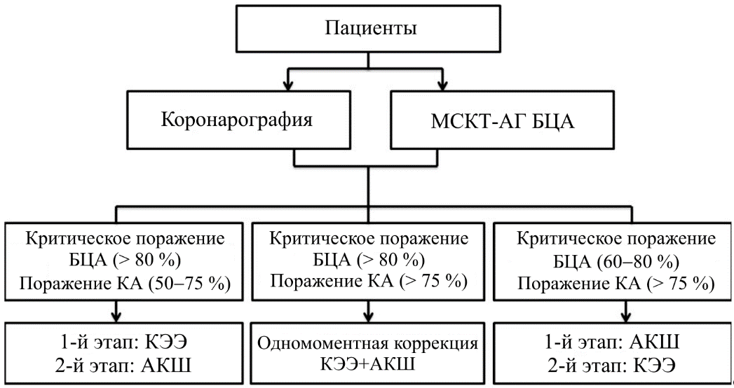 При наличии критического поражения коронарных артерий более 75 % и поражения сонных артерий до 80 % рекомендуется первым этапом выполнять АКШ. Вторым этапом, после полного восстановления после АКШ, пациенту должна рекомендоваться плановая КЭЭ для профилактики ишемического инсульта. При критическом поражении сонных артерий более 80 %, при сочетанном атеросклерозе коронарных артерий менее 75 %, учитывая высокие риски периоперационного инфаркта миокарда при КЭЭ, первым этапом рекомендуется выполнять реваскуляризацию головного мозга. АКШ пациенту выполняется вторым этапом, когда уменьшены риски ишемического повреждения головного мозга вследствие критических поражений сонных артерий. Оптимальным временем между этапами оперативных вмешательств считается один месяц после выписки пациента домой после первой операции. Пациенты, имеющие критические поражения в обеих артериальных системах (стеноз ВСА более 80 %, стеноз коронарных артерий более 75 %), представляют собой самую тяжелую когорту. Таким пациентам рекомендуется выполнять одномоментное вмешательство на бассейнах коронарных и сонных артерий в условиях одного наркоза. Сочетанная операция должна производиться опытными хирургами, а также в условиях клиник, имеющих необходимое оснащение для интраоперационного нейромониторинга. Многие хирурги относятся настороженно к методике одномоментного выполнения двух операций ввиду большого объема оперативного вмешательства.