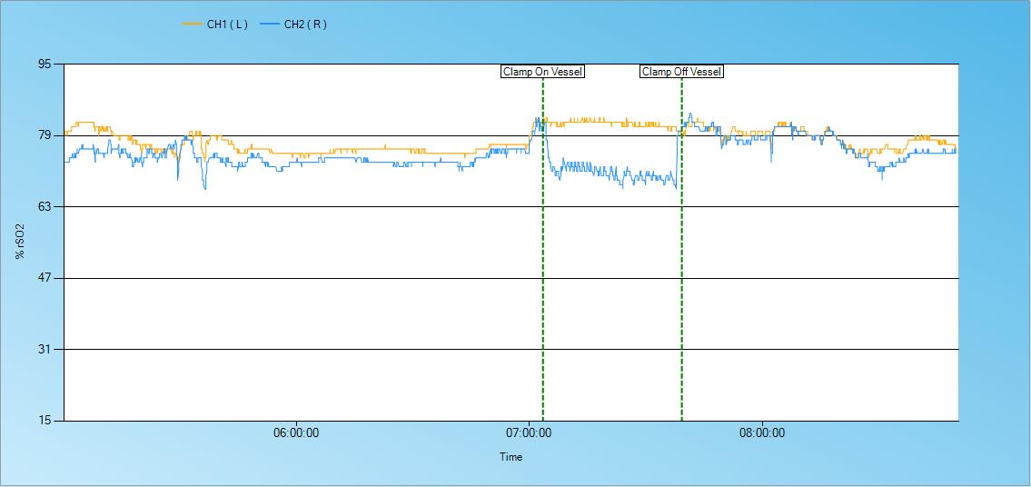 Рис. 2. Показатели церебральной оксиметрии при КЭЭ. Отмечено время наложения и снятия зажимов с сонных артерий