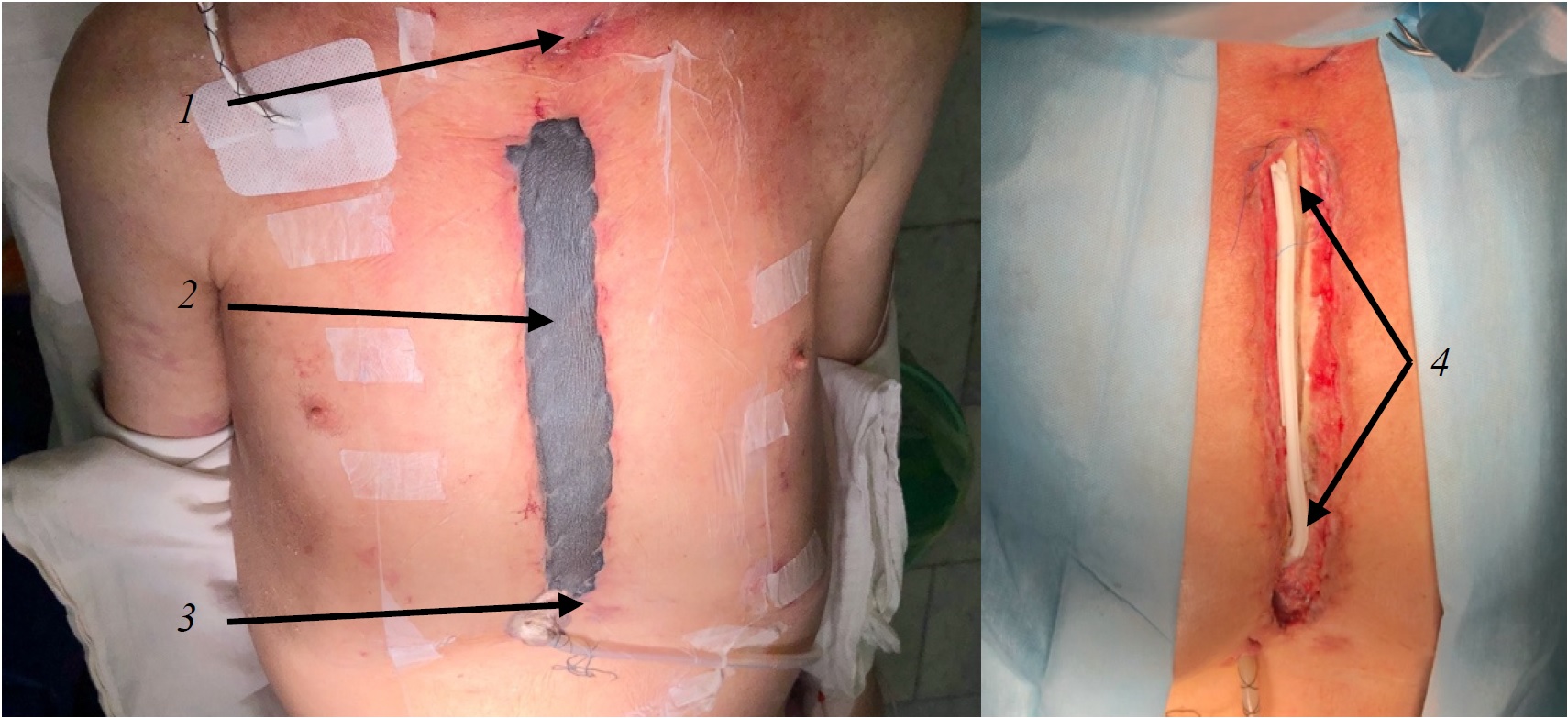 На рис. 1 показана накрытая губкой и пленкой рана грудины. Ниже расположения мечевидного отростка визуализируется трубчатый дренаж, с помощью которого происходит контакт между вакуумным агрегатом и полостью раны. На 2 см выше раны определяется ТСО. На правой стороне изображения видна воспаленная рана – с удаленной системой вакуумной аспирации. Посередине, на всем протяжении раны – дистальная часть дренажа, которая была погружена в специально формированное ложе на губке.